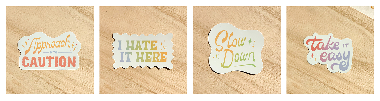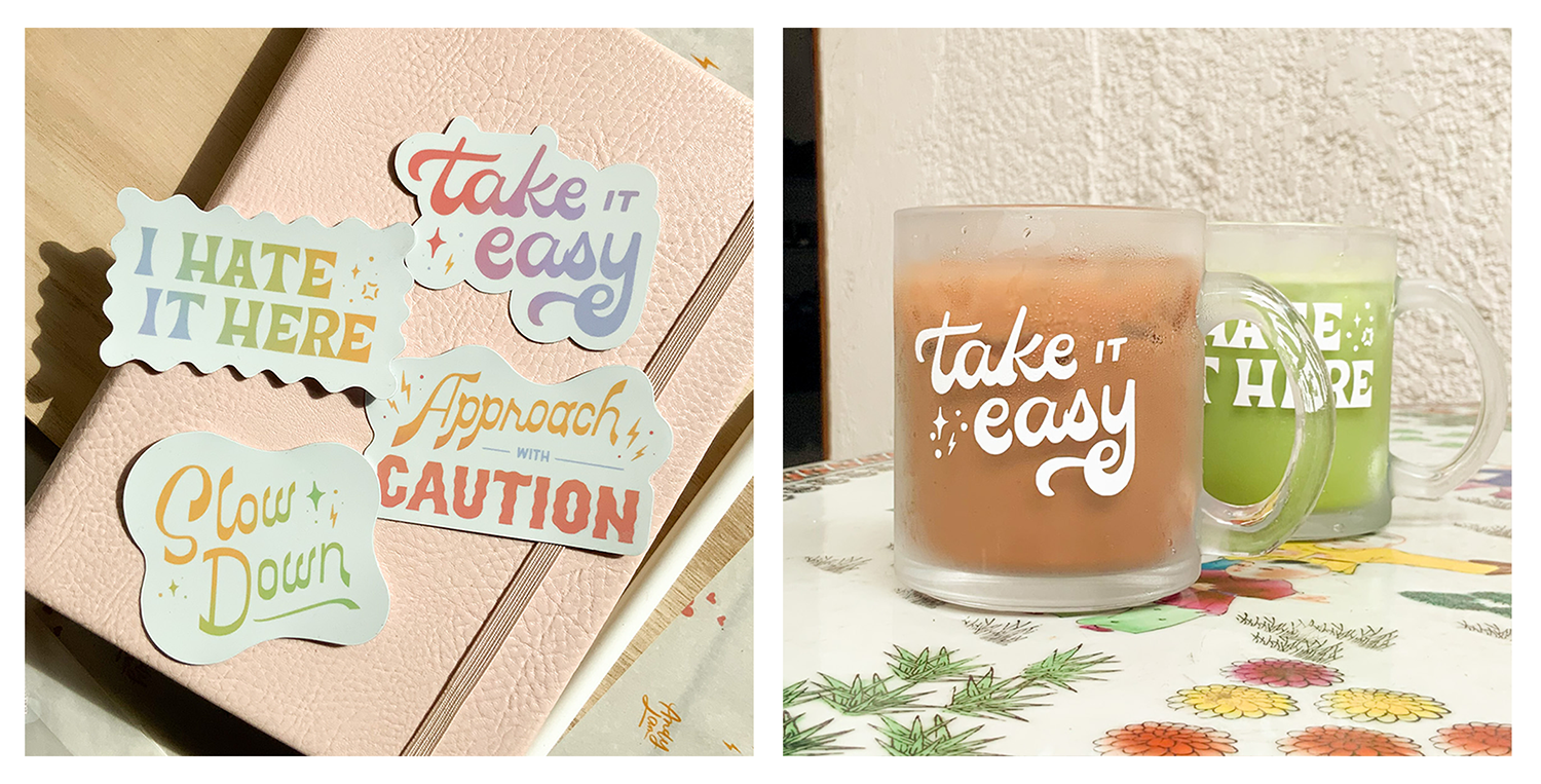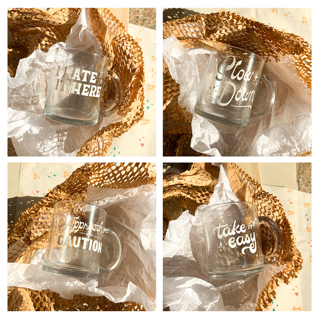As a non-coffee drinker, the concept of designing mugs primarily used for coffee is not lost on me. However, I am also not a morning person, so I know the feeling very well. I had a lot of fun thinking of quick short jokes to convey morning grumpiness as well as a few pick-me-ups to balance the snark. I also wanted to experiment with new styles that can also match the tone of its phrases. These were also made into matching stickers to make them accessible to people internationally because broken glass shouldn’t be something you unbox.